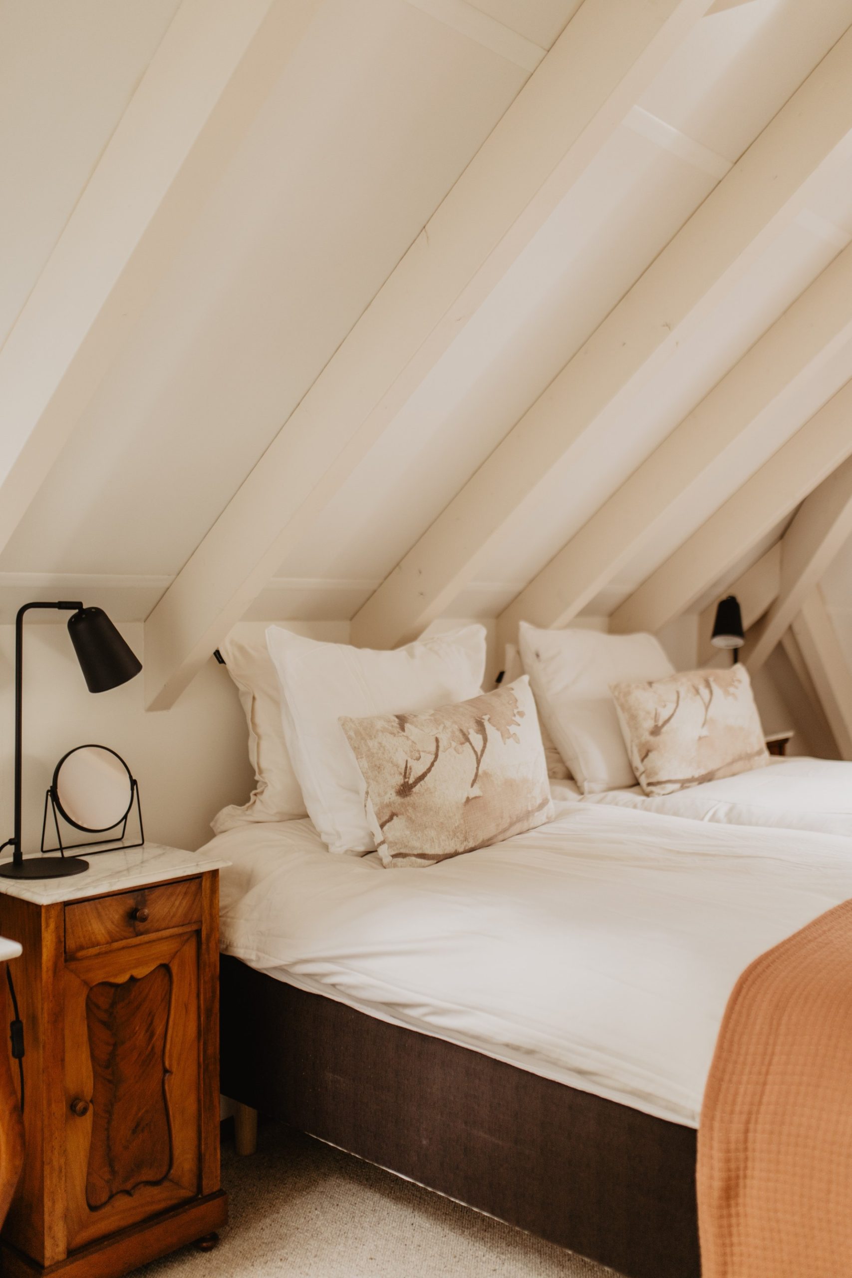 This room on the first floor has 2 single box spring beds (double bed) and a small sofa bed. The room is cozy because of the beamed ceiling and has a modern classic look.