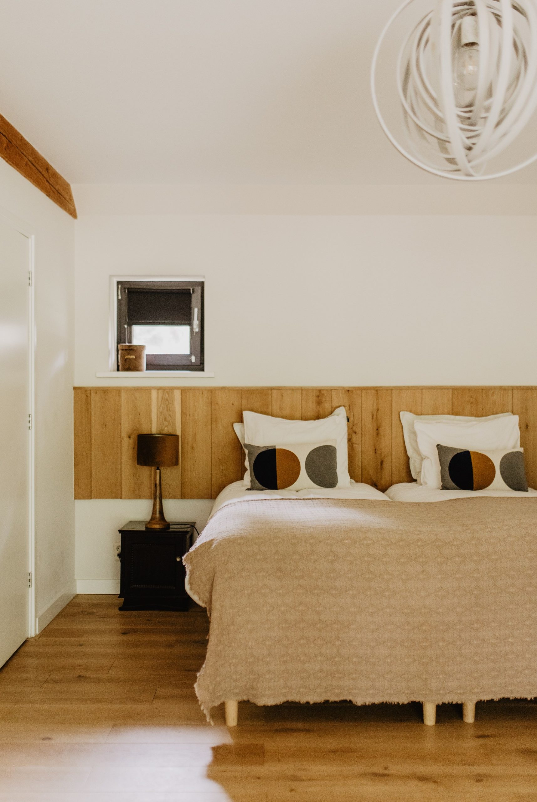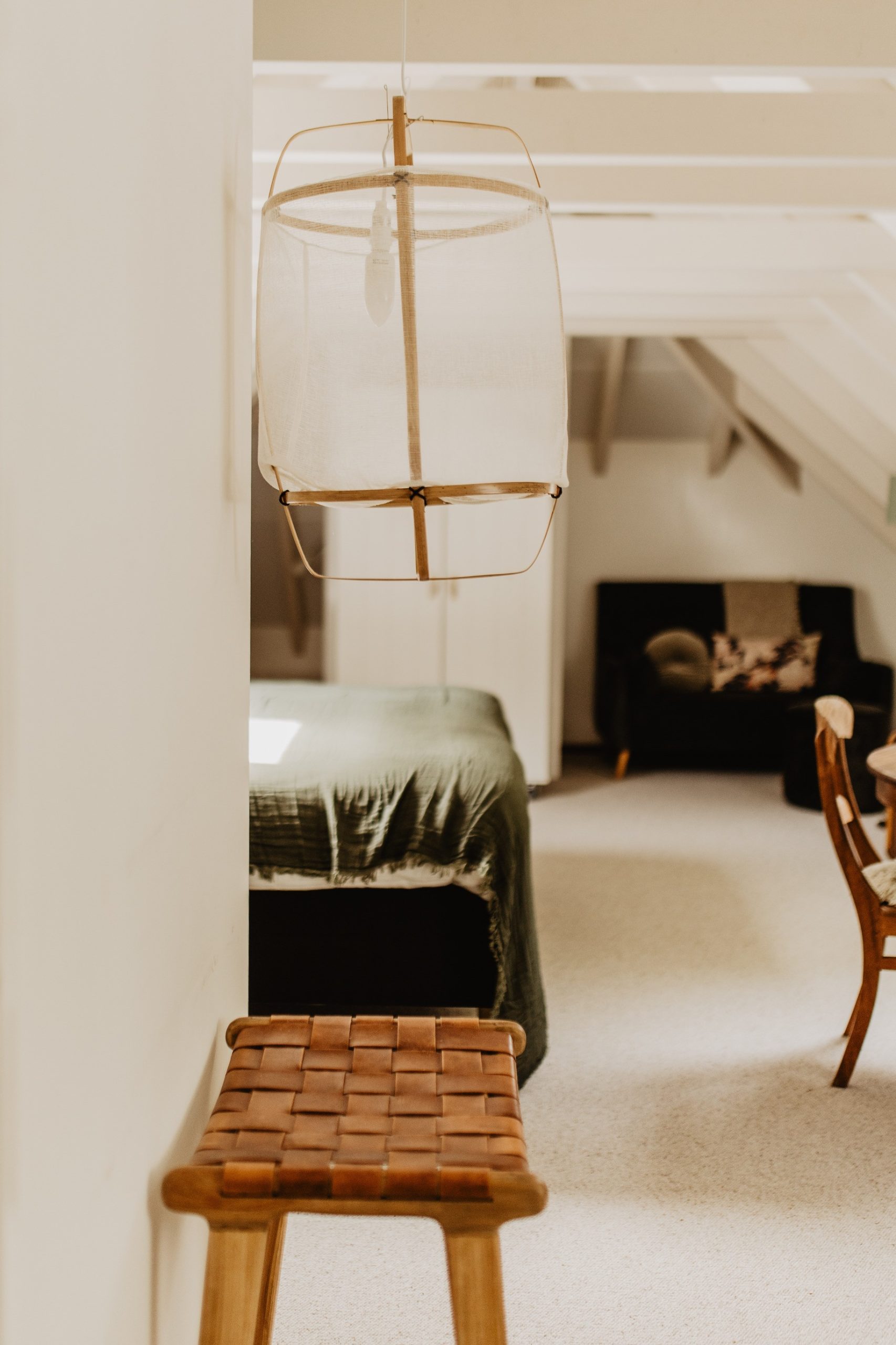 This room on the first floor has 2 single box spring beds (double bed). There are 2 extra mattresses low to the ground (on a slatted base) in a niche, suitable for people who feel ‘young’. There is also a bench and coffee table and a table with 4 chairs. The style of the room could be called ‘hotel chic’.