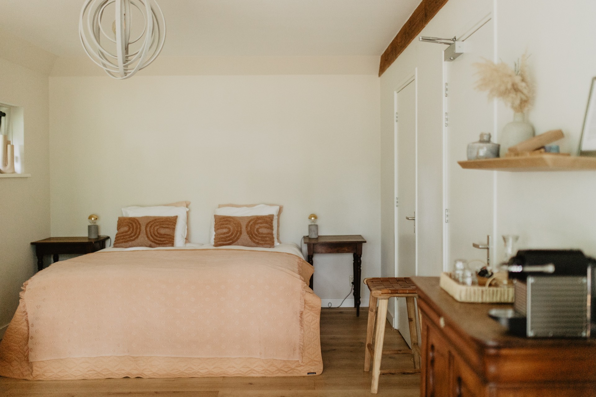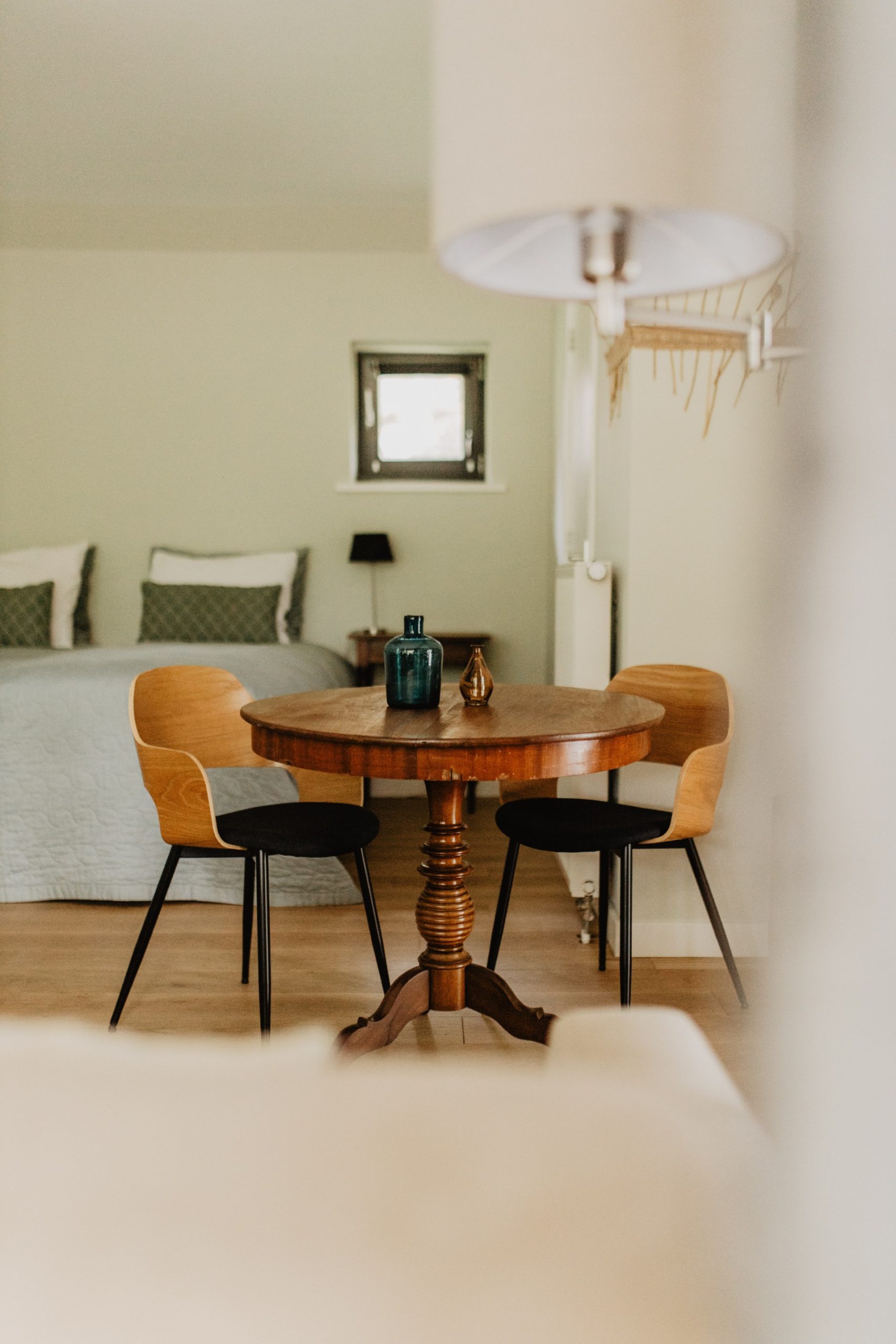 This room on the ground floor has 2 single box spring beds (double bed) and a fine, modern sofa bed. There is also a small table and 2 chairs. Currently, the room is gray / blue in color and you could call the style ‘nostalgic chic’.