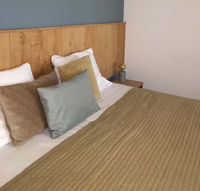 This room on the ground floor has 2 single box spring beds (double bed) and a fine, modern sofa bed. There is also a small table and 2 chairs. Currently, the room is gray / blue in color and you could call the style ‘nostalgic chic’.