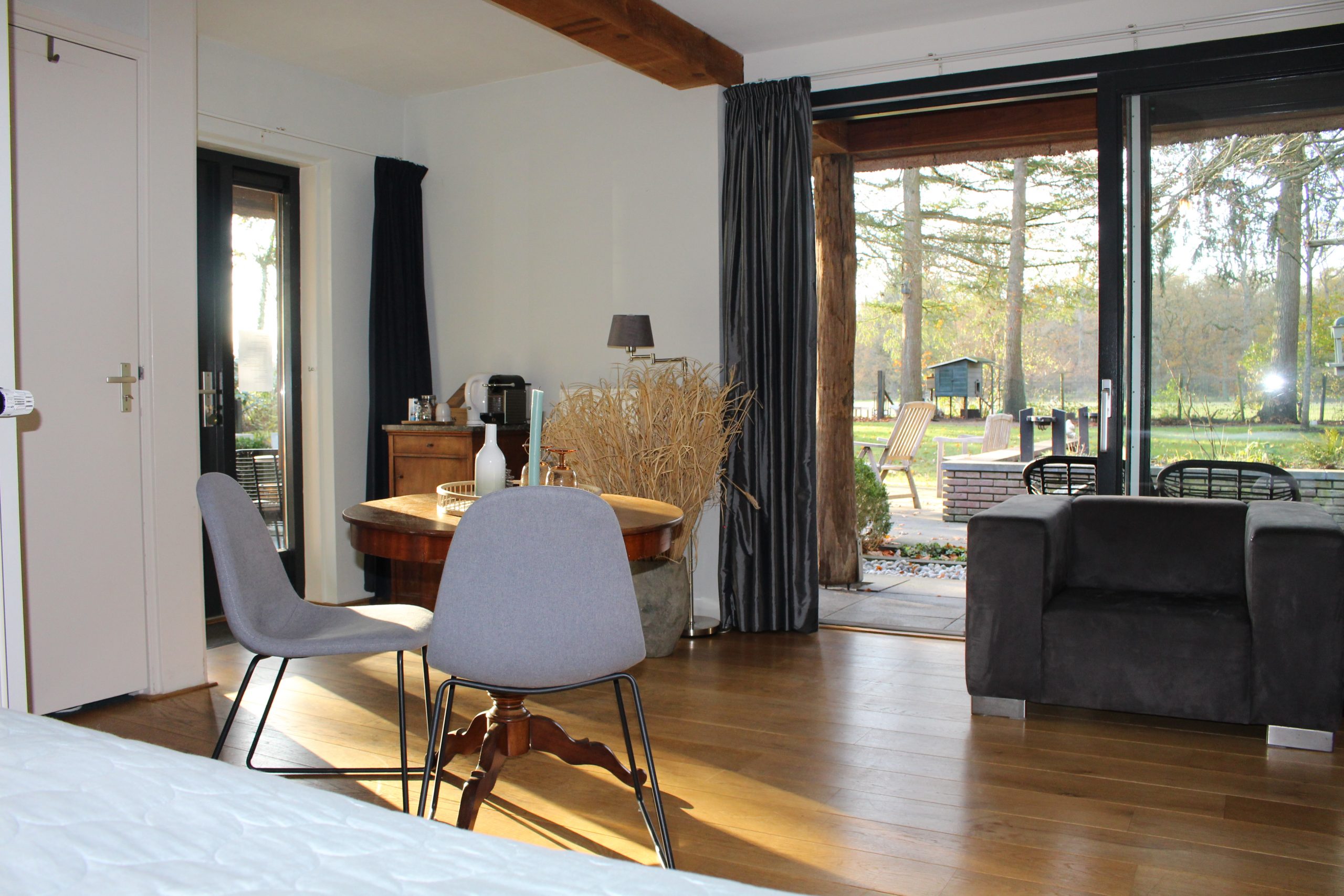 De kamer heeft een prachtig uitzicht op de natuur en een schuifpui naar je eigen terrasje met tafel en stoelen.